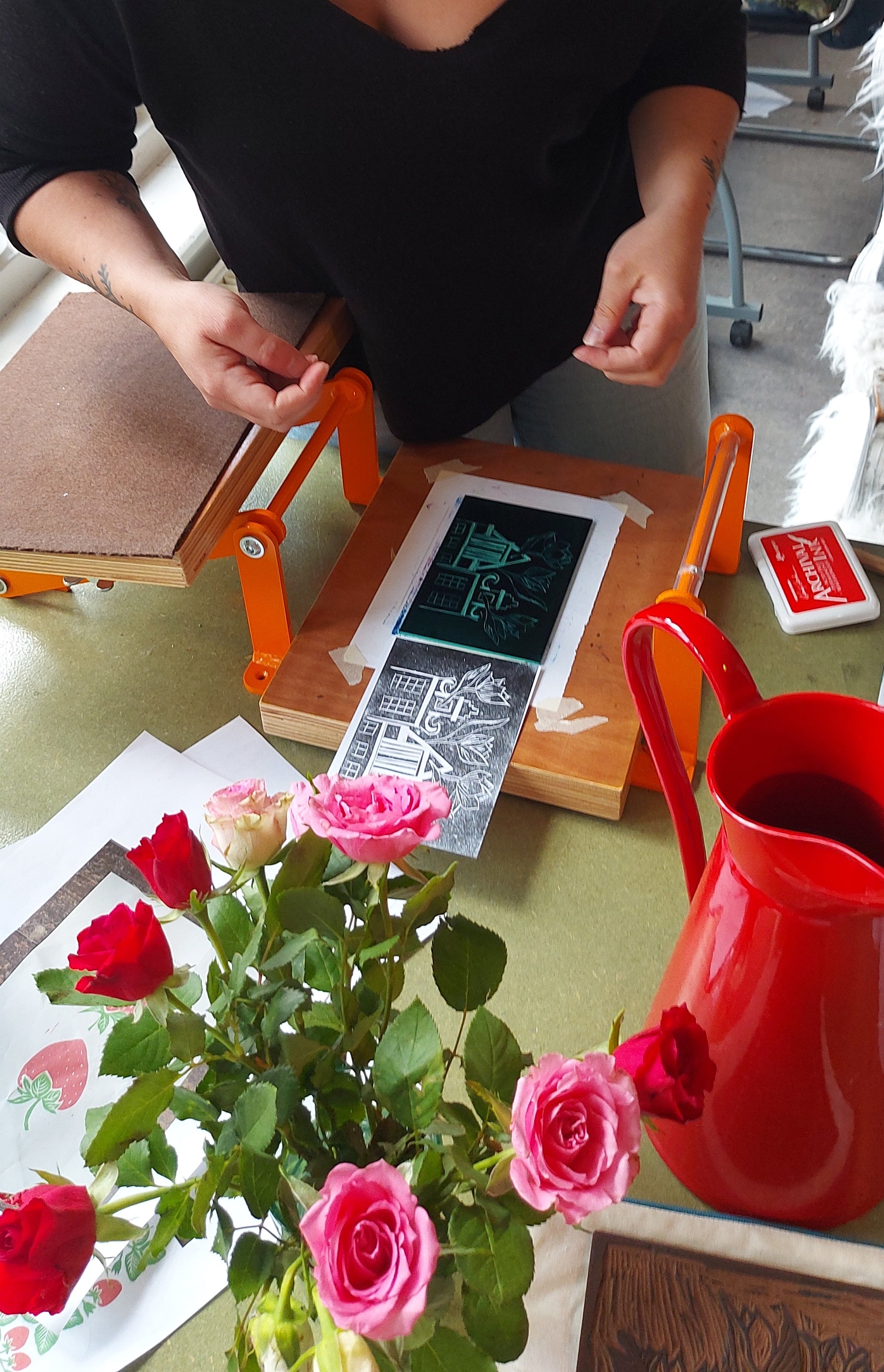 During the 2 hour session we will adapt for your needs. We can together try different paper weights (from ultra thin Japanese paper, to juicy etching paper), experiment with colour gradients, and even print on a tote bag! Or perhaps you already have a series in mind, for invitations for example, and need my help with completing it. Dealers choice.